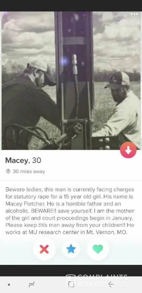 There is a profile under Macey Fletcher that is saying he is being prosecuted for statutory rape because he had sex with a 15 year old.
