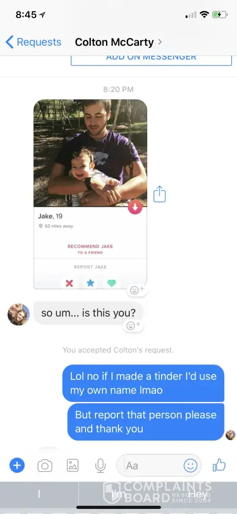 Someone is on tinder using the name Jake and is currently using my pictures as their profile. I would like to be resolved immediately because I do not want my pictures out there for other people to get hurt from a catfish. Two that's freaking creepy and weird that someone is using my pictures as a profile. 3 I do not want my name being thrown out there for other people to talk about