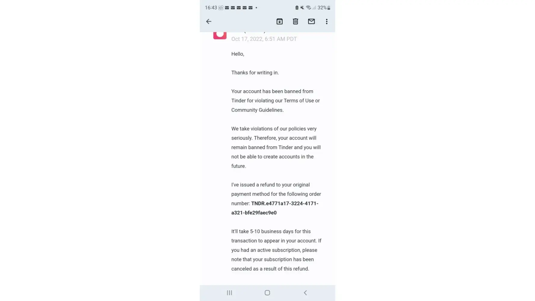 After contacting their 'support team' to try to understand why, their agents repeatedly responsed with the same, vague, copy-pasted response (lifted directly from their website with no change) that "your account has been banned from Tinder for violating our Terms of Use and/or Community Guidelines" and "we take violations of our policies seriously and don't offer an appeals process at this time. This decision is final, so you’ll no longer be able to access your account or create new accounts in the future."
