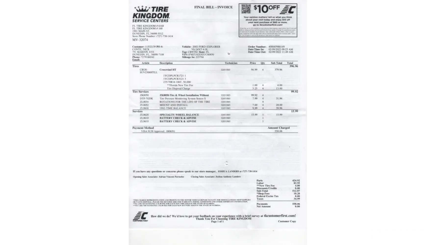 I never gave my consent to perform any of these services and Tire Kingdom certainly did not obtain my approval in writing. It’s clear to me that Tire Kingdom decided to charge me whatever they wanted, because I am a senior citizen and of Hispanic heritage. This is clearly a case of discrimination and ageism.