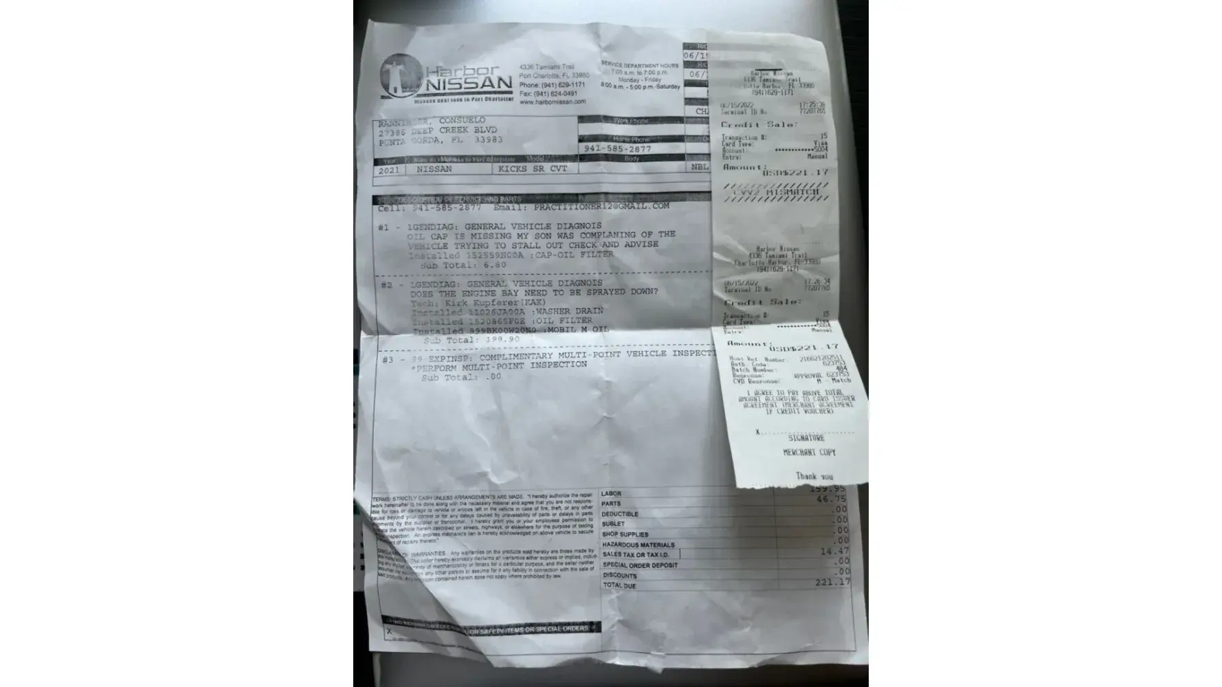 My son took his 2021 Nissan Kicks to the Tire Kingdom located at 24491Sandhill Blvd., Punta Gorda, FL on 5/14/22. My son called me while he was driving on 6/15/22 and said his car was starting to stall. I told him to meet me at the aforementioned location of Tire Kingdom, but the facility was closed. He drove home and after the car cooled down, I looked at the engine. The oil cap was missing and there was oil splattered all over the engine. I had to take his car to Nissan and had to have them replace the oil cap and clean the engine. I received a bill for $221.17. I have talked to the manager at Tire Kingdom about this and he keeps blowing me off. I think that whoever changed my son's oil on 5/14/2022 did not replace the cap and put it on loosely. The Nissan is brand new and my son is the first owner of this vehicle. I think we should be reimbursed for the incurred charges that occurred due to a poor job that was done by Tire Kingdom. Please help me with this. Thank you for your time.
