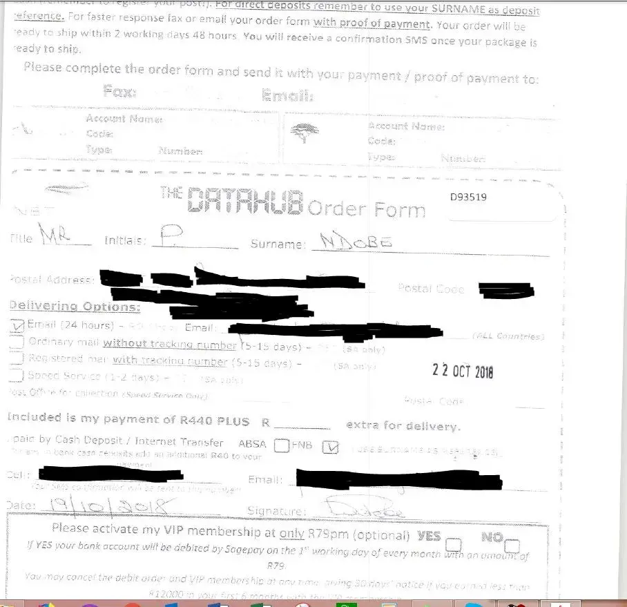 I responded to an advert an advert in the internet by registering by R440.00. The money was deposited by internet banking their FNB account no [protected]. according to their advert the their package would be sent to my email address within 48 hours after receipt of my registration fee and that an sms would be sent to me before shipment of the package. The transaction was done on the 19th October 2018 and up to now the package has not been delivered. They also sent me the LOGIN details of Username. D93519 and Password D93519 which i have found to be fictitious.