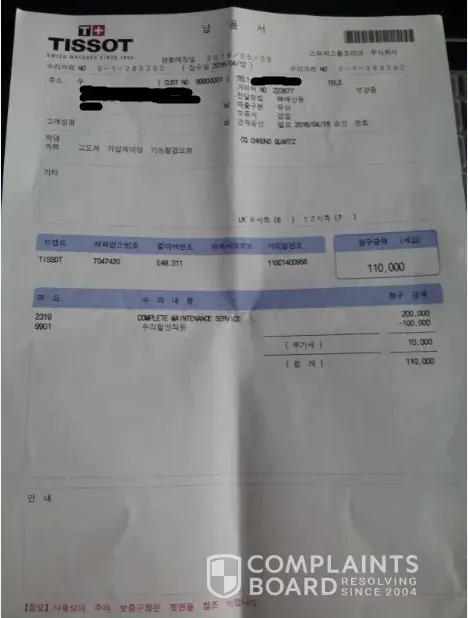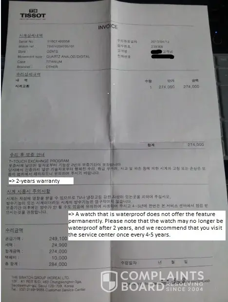To wrap things up, I bought a watch for 516 USD and Swatch Group drained 596 USD from me for a defective watch. I was sold an unqualified product in the guise of a promotion, unless there is no OQC process. I would suggest Tissot Korea to refrain from using the term Bang Su (waterproof); it should be Nae Su (water resistant).