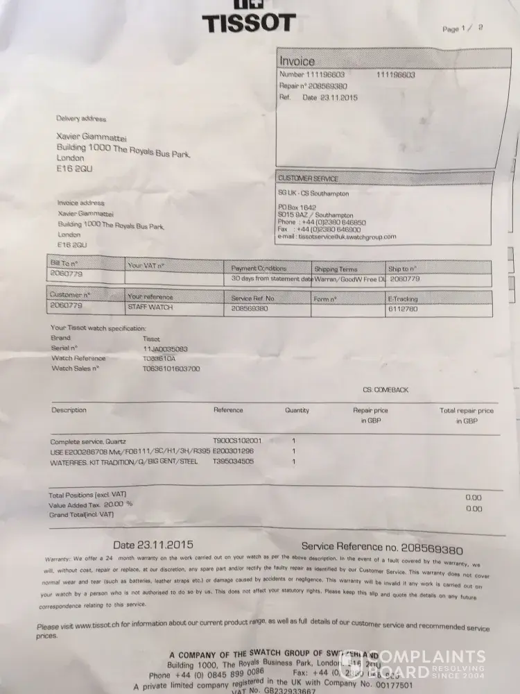 I am also going to put my complaint forward to the Complaints Board for Tissot)