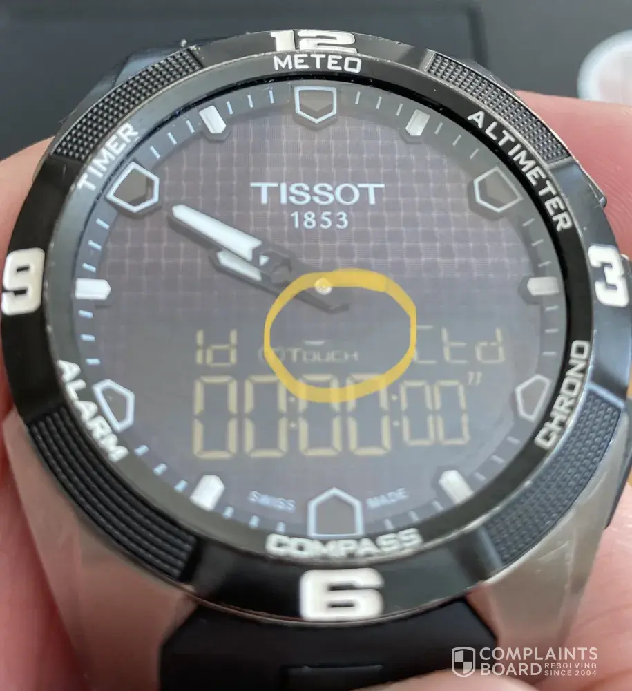 Hello, I got my Tissot Touch Solar T091420 A/ FCL U6D R2T/ 15 B C0095687 as gift three years ago, and now have detected a blob on the display (up in the middle part of the display under the centrum part of the clock face). Read about that issue, and asked Tissot about that issue on their pages- the only reply was that I have to contact local service.