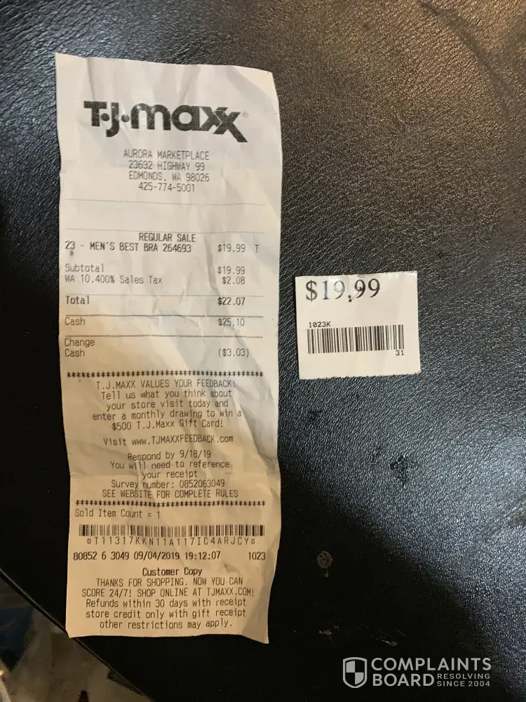 About 1912 hrs on 9/4/19 I purchased a shirt from this branch of TJ Maxx in Edmonds. After the clerk have scanned the item she looked at the tag and ripped it off from the shirt which is securely fastened and told me that this is not the tag. I was shock and don't know what to say because I was there as a customer to purchase the shirt and I am not aware if...