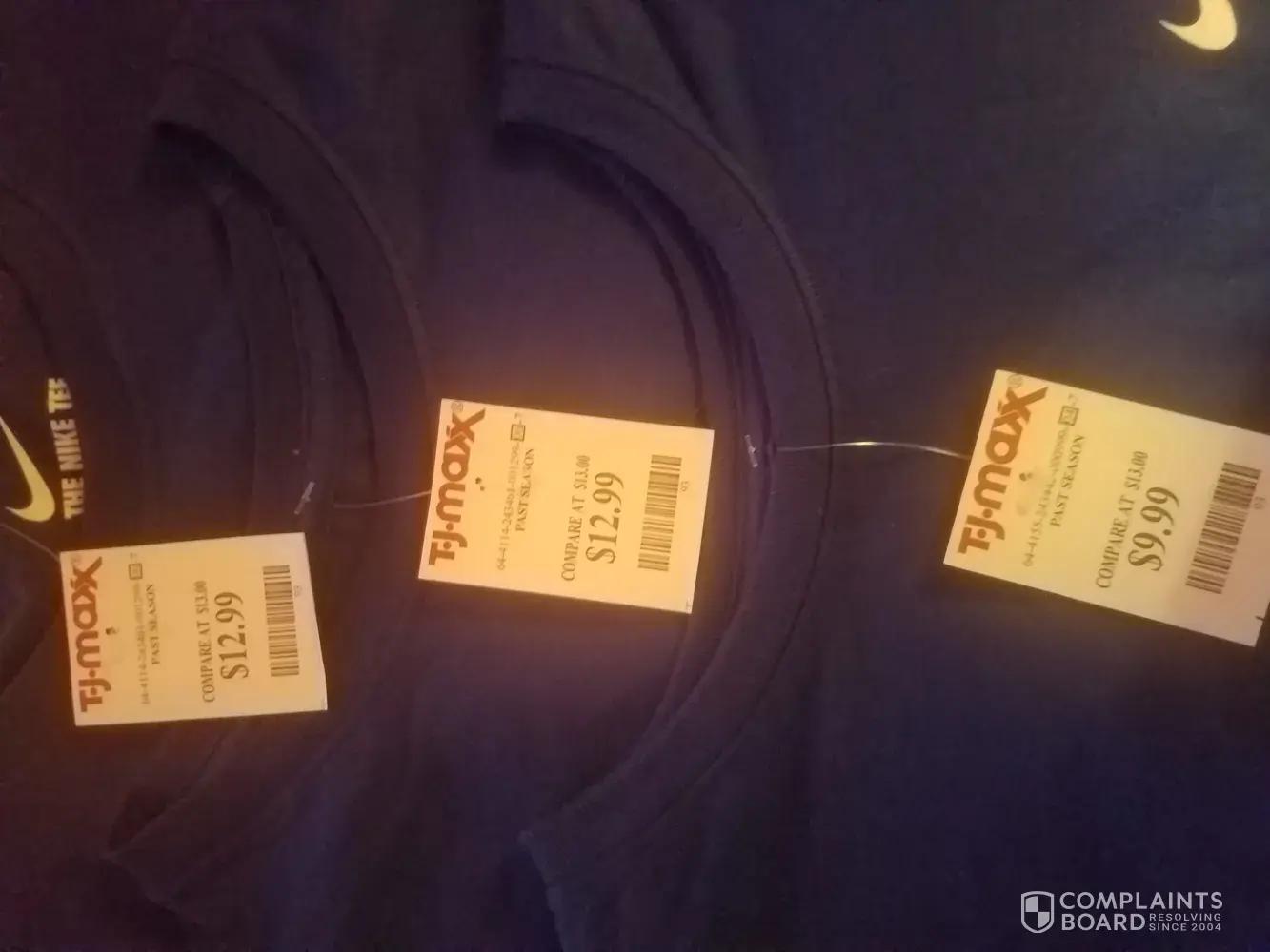 Purchased today 3 Nike mens t shirt exactly a like in every way. The price compare tj max ticket is 13.00 on all 3. 2 t shirts were 12.99.and 1 t shirt 9.99. Explained to cashier who refused to call a manager or give me the correct price. It was obviously mis marked. Very unhappy with the customer service I received. Would like to get the correct price enclosed a photo of shirts with your price tag attached