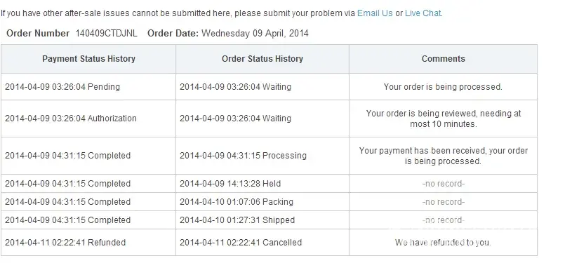 Ordered some Items from them on Sept.01, 2014. Order # and Track # received, confirmation of FULL Payment via Pay Pal.