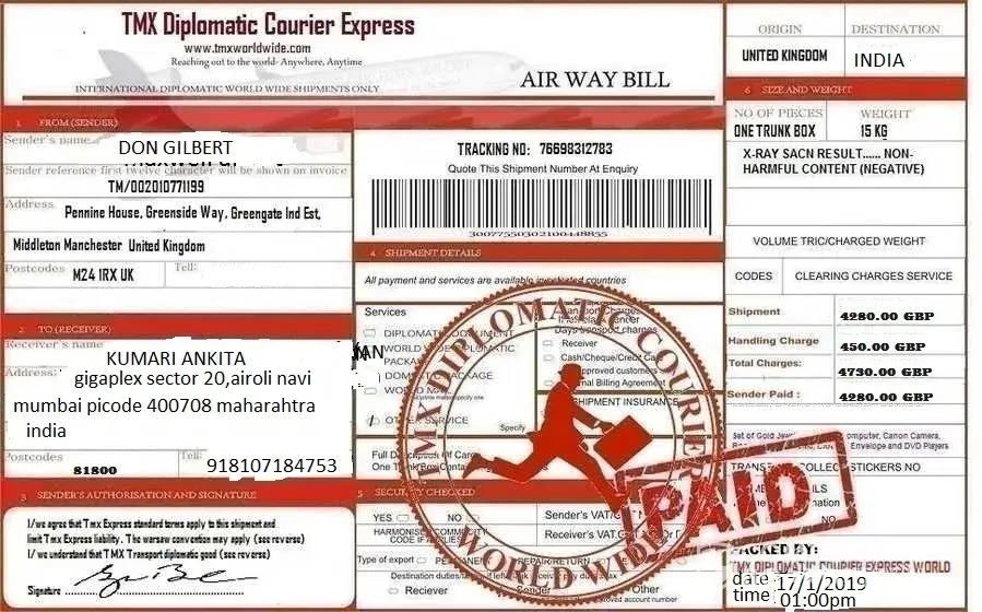 Conclusion: As soon as we receive confirmation and evidence of payment of the charges, we will dispatch your parcel immediately within few hours to your designated address.