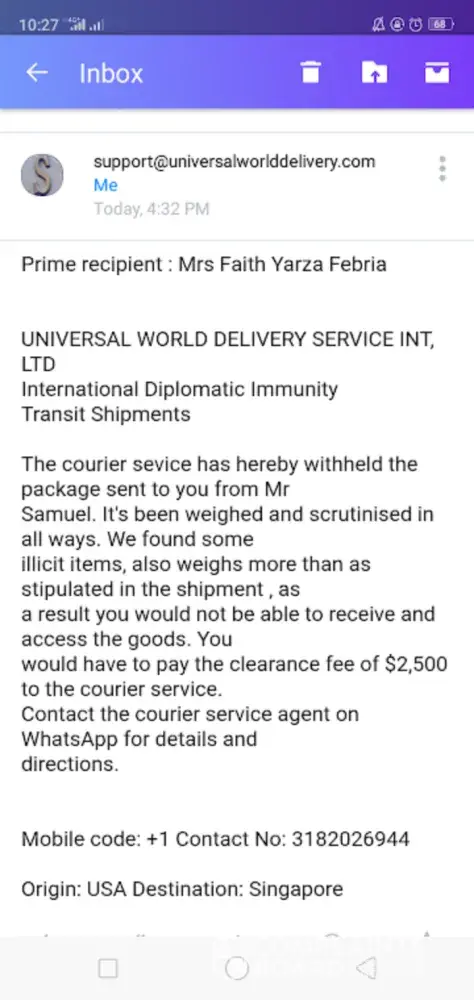 I have sent the parcel containing HP Laptop computer and JO Malone Perfumes, and one Samsung GALAXY S5 phone handset, a neckless with a lily of valley rose flower and a Diamond ring and the sum of $10, 000 dollars in sealed pack to the same enable you settle for your fees and daily needs and to take good care of yourself for me, I can imagine how hard you could be working just to raise the half expense to make a life better for your family too. Just accept this token from me. Since there was no time to contact you any longer for your bank account details to do a bank transaction I had no option than to seal the money in the same pack with a rose flower right in the same pack.