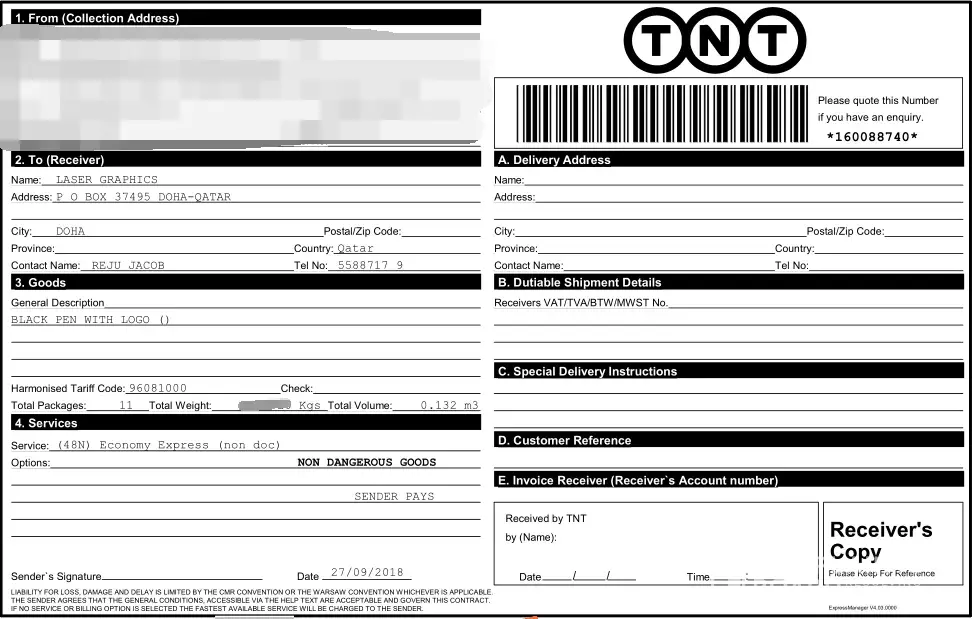 We are Laser Graphics Company in Qatar . We have Sent our Goods Promotional Gift Items through TNT China Still not received . Now goods are holding singapore.