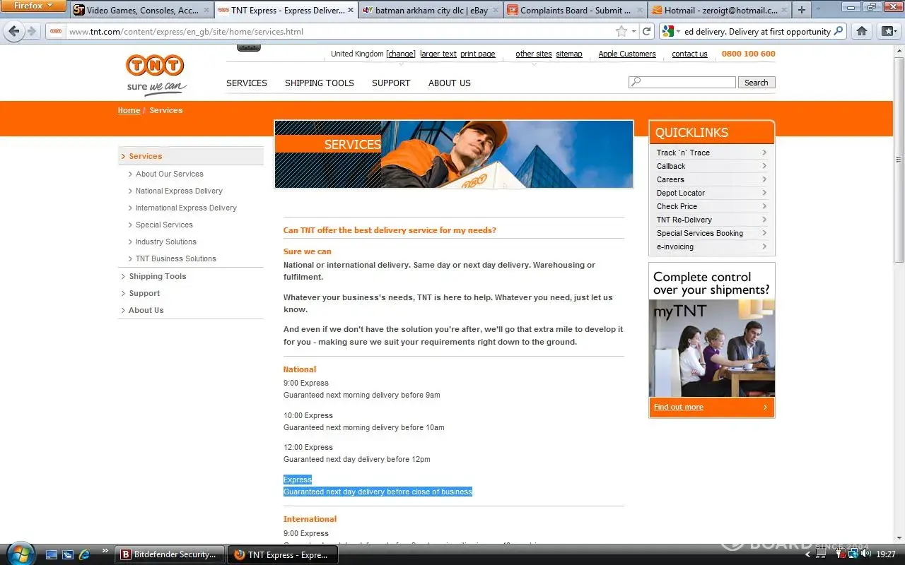 I ordered a game from shopto.net and was told the delivery would be issued by TNT. On the day of the delivery I was guaranteed that I would receive the game in the time window of 12:00 am and 18:00 pm. at 17:50 pm after checking the status of the parcel i was shocked to find that it was returned to the depot in Deeside, I quickly rang TNT and was told the driver in question ran out of driving hours and that i MAY receive my package tomorrow even thought the guarantee states and I quote "Express Guaranteed next day delivery before close of business" which they denied to be true PLEASE PLEASE PLEASE do yourselves a favour and dont use this company you may never receive your package i know i never will again.
