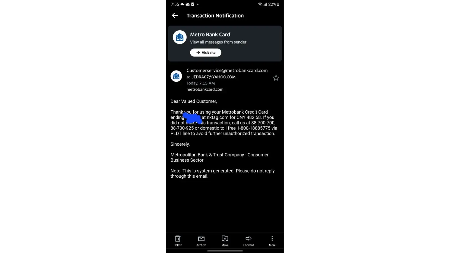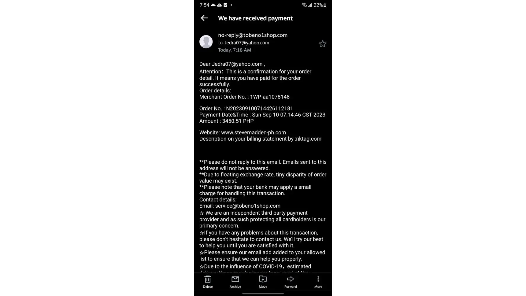 Just had a transaction with stevemadden philippines, a few minutes ago actually, and got suspicious when i received the transaction email that the amount authorized is in CNY. Searched nktag online immediately and their email address then found this thread.