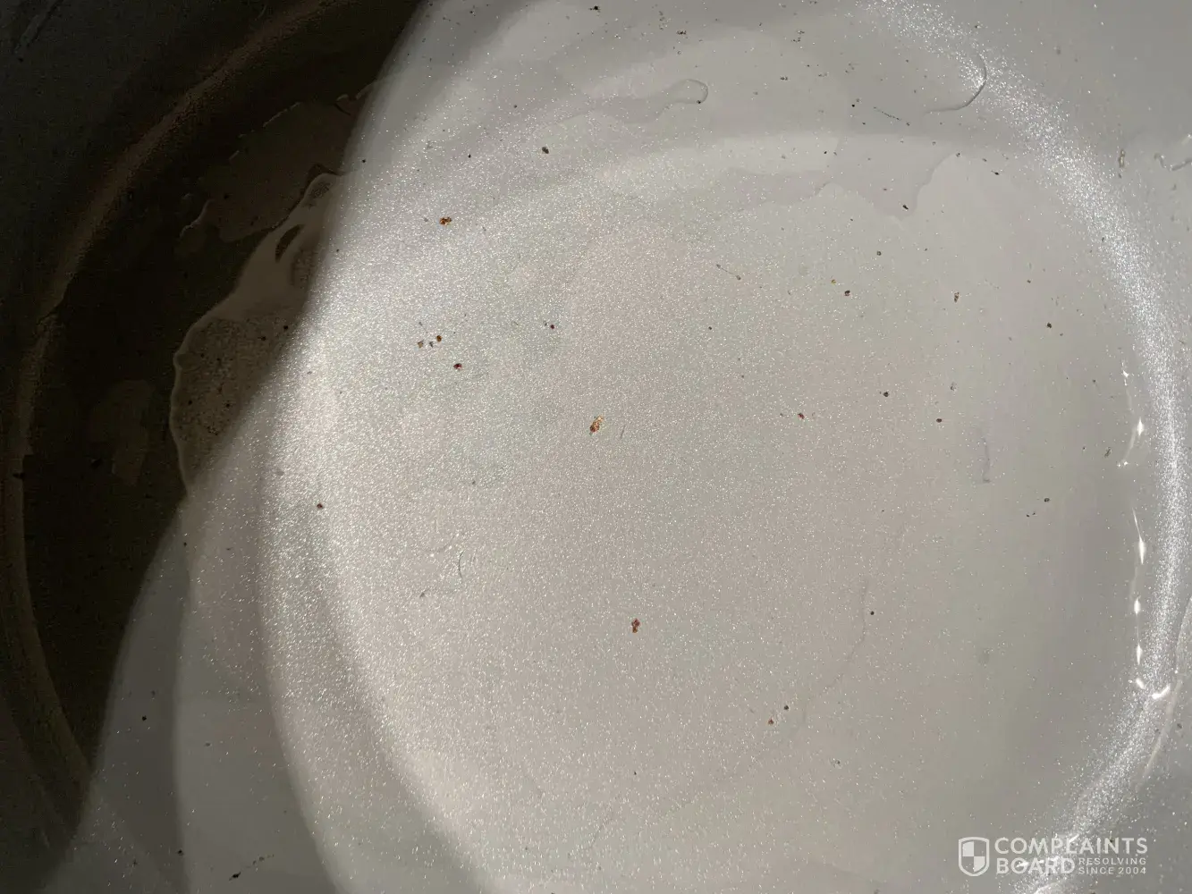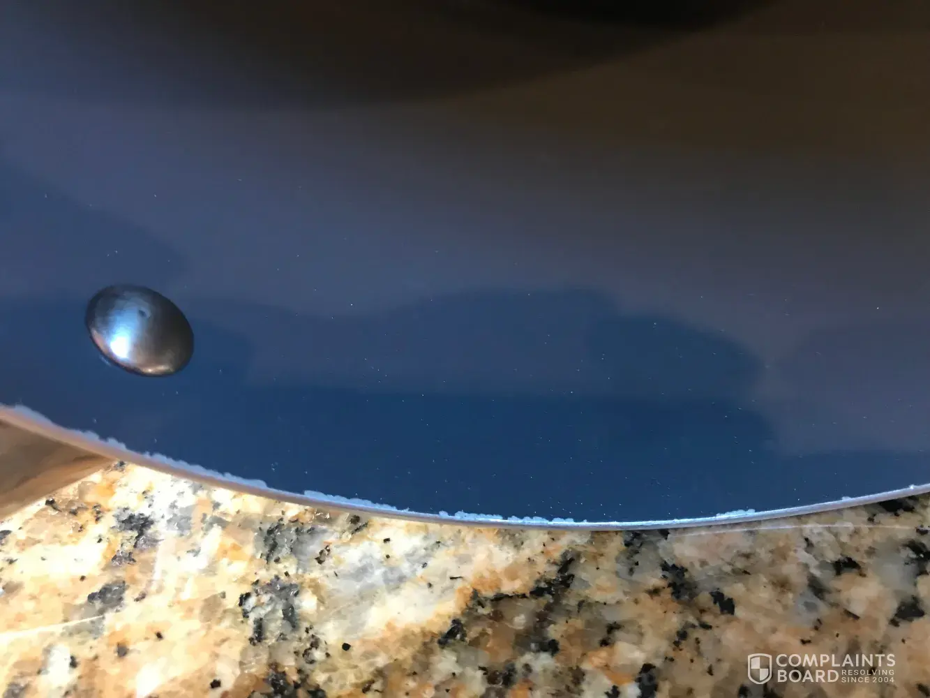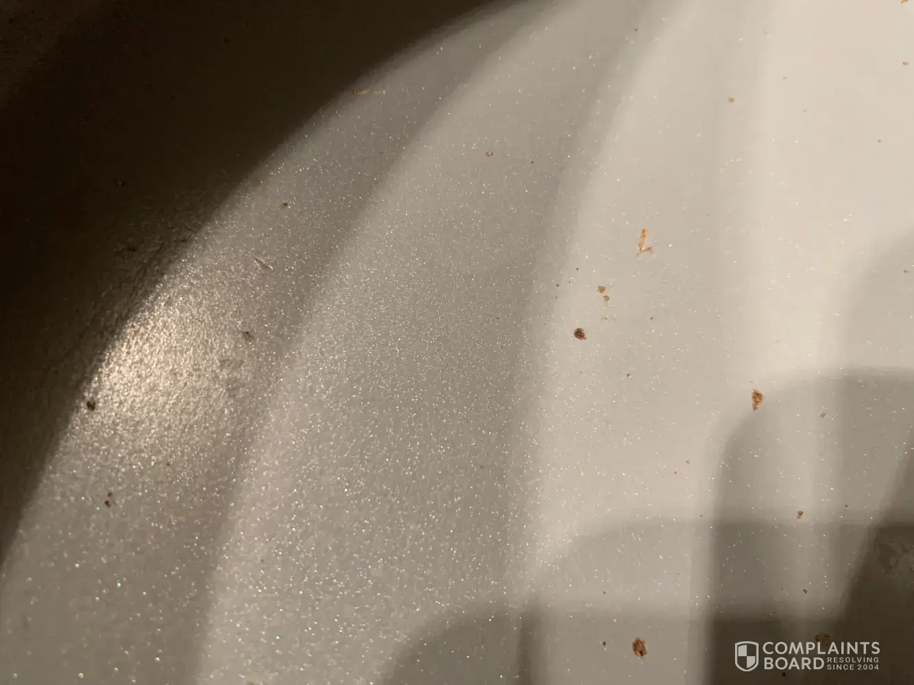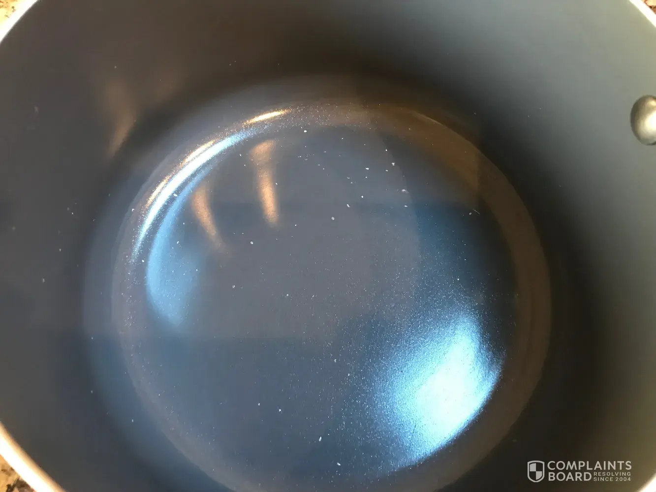 AS you can see the 1st picture it has all the white chip marks on the bottom of the pot and the 2nd picture shows how the coating is pealing from the edge on the top of the pots.