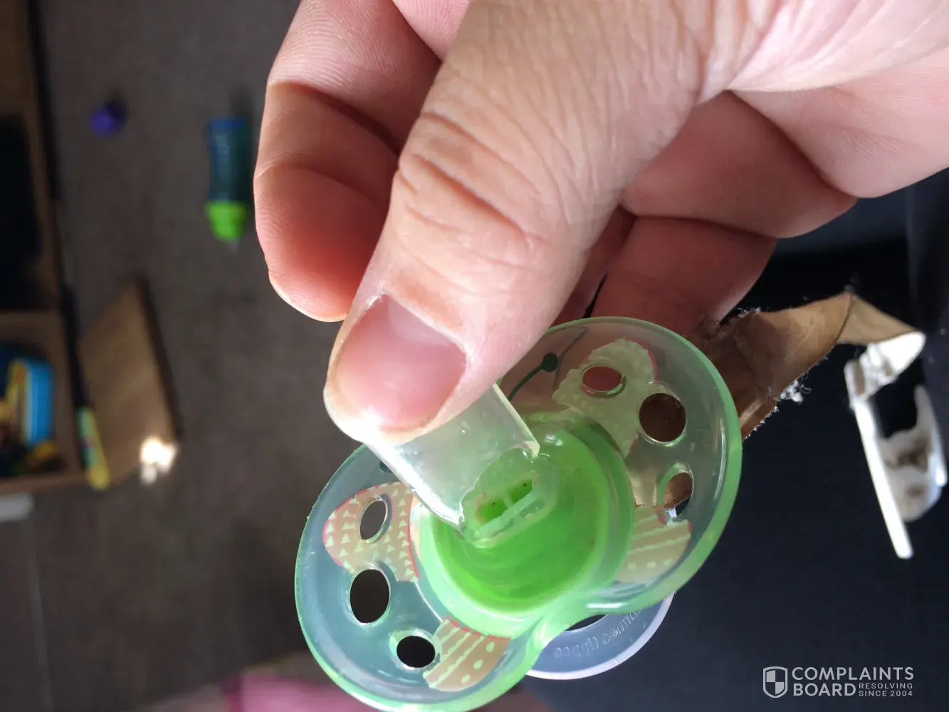I brought these dummy's about four weeks ago we have never had a problem with any of these products and have always used them, today I noticed the inside of the clear bit looked wet so upon further inspection I noticed a massive spilt going through the top of this dummy ! I am horrified as if I had not seen this my daughter could have choked! For the money we as parents have to spend on these products I am disgusted to find this as there are only 4 weeks old and been used for 2 weeks I will be making a public announcement about the rubbish quality of this product if this complaint is not resolved