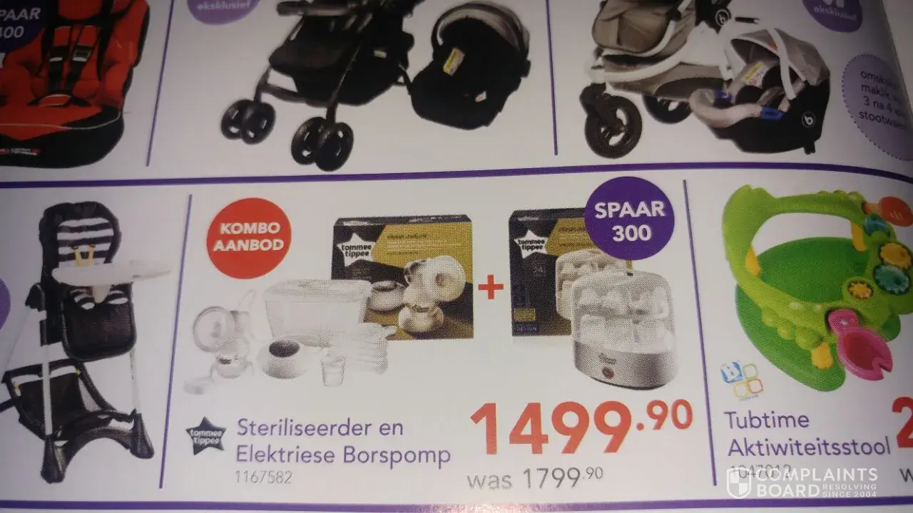 My complaint pertains to a recent advert placed in the "babies r us" booklet in which an electric sterilizer and electric breast pump was advertised as a combo deal for R1499.90