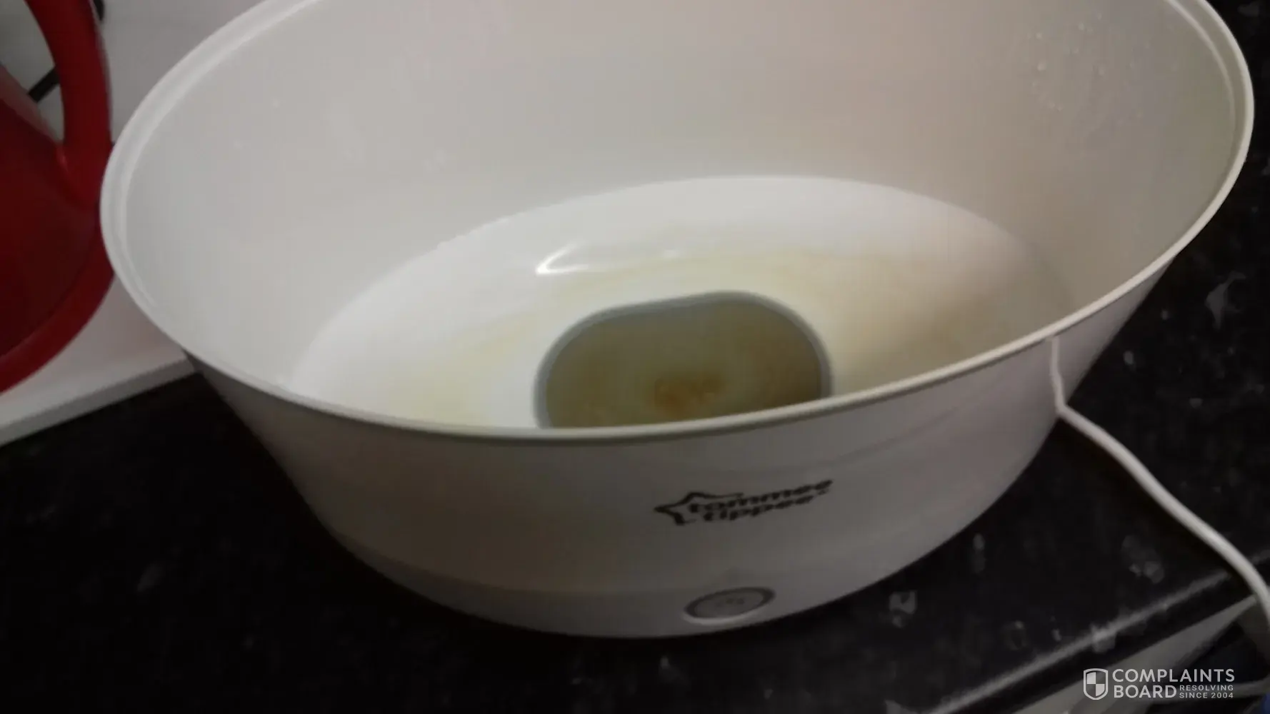 I am writing today to complain regarding the Tommee Tippee steriliser and bottles I bought from yourself. After receiving the steriliser, my daughter was born on the 25/03/17. I started using your products after being recommended by numerous individuals who rates your products as 'brillant'. Unfortunately my experience hasn't lived up to my of expectation of the name Tommee Tippee. I received the Steriliser and 4 bottles (two 9 oz and two 5oz bottles) after a week of using the Steriliser the bottom of the Steriliser started to show a brown marking. So I continously tried to clean it but unfortunately it has gotten worse, too the point were I am no longer using your products. I was concerned when I realised it was limescale. I found this to be a concern and and worry as my daugter was a week old. This could of had a impact on my daughters health. To add the bottles we recieved, the oz marks printed on the Plastic are now coomig off. Which is another concern when pouring water I do not know the correct marking on the side of bottle. I now know I will not purchase anything again from yourselves, which is a disappointment as I know how popular this company is.