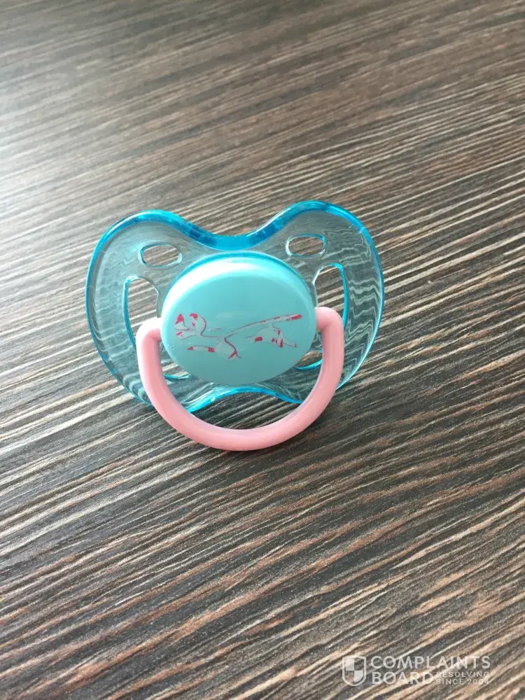 My daughter is 4.5 months old, the other day she was sucking and holding her dummy when I took it off of her I noticed the design had come away. I am worried that she has swallowed some of this design. I am not happy that this has happened especially as your brand is one of the leading on the market and a brand I trusted to be safe.