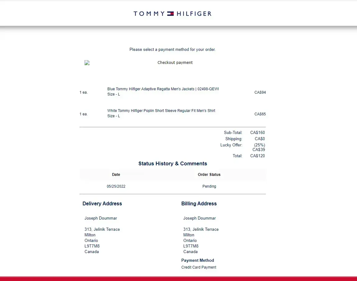 I ordered a jacket for my husband from official website of tommyhilfiger canada and my card was charged for it. But I never received the confirmation mail. The status of order says pending. Now they are also not replying to my mail. I want a refund ASAP. I am also attaching the screenshots of website and order status being shown om the website. Kindly help me resolve my issue!
