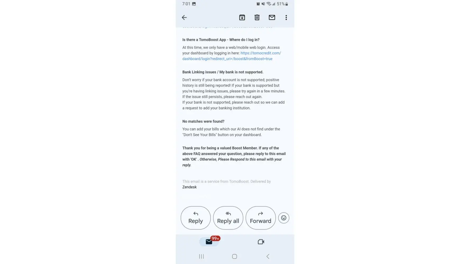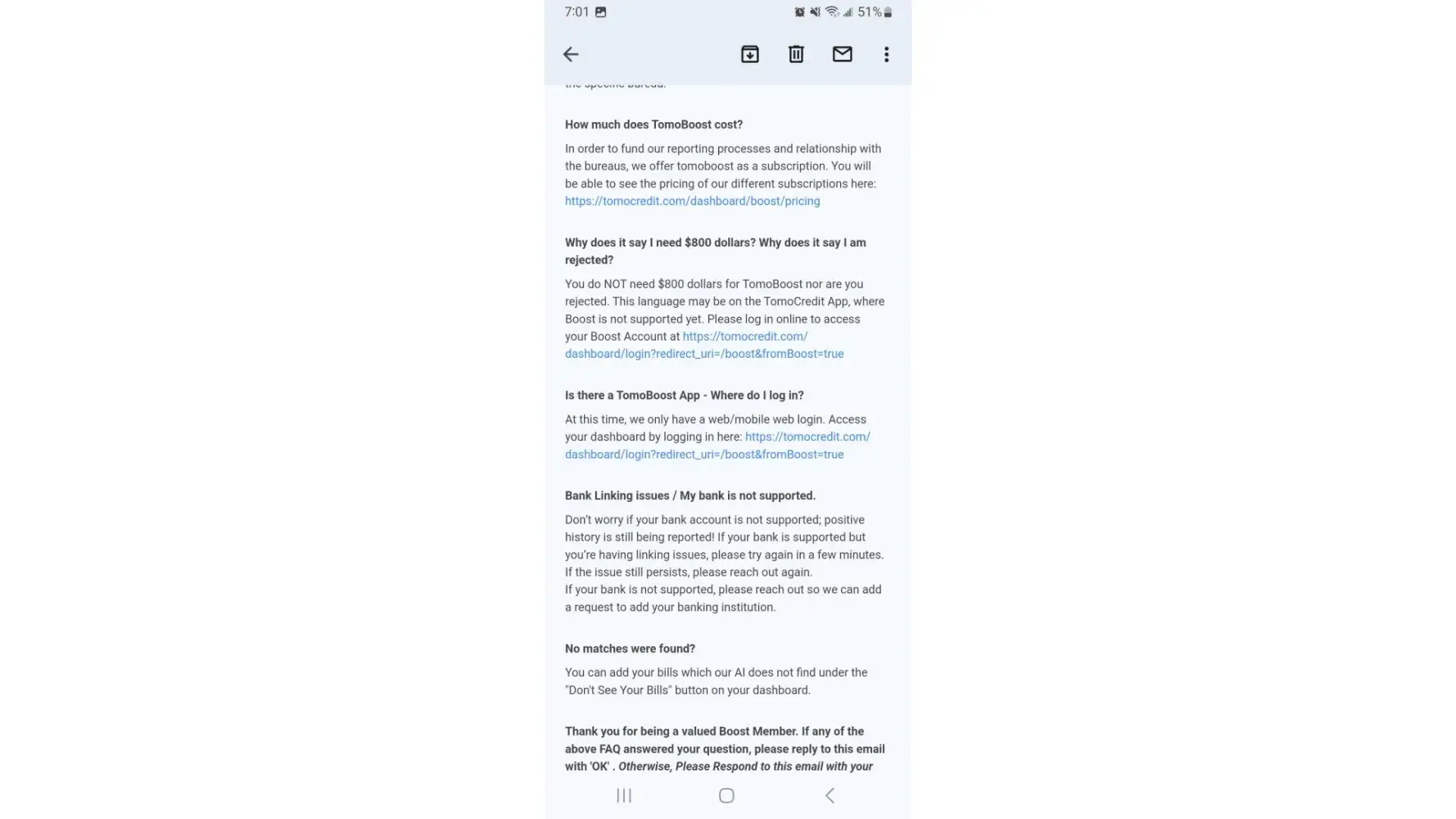 Tomoboost is charging my debit account for credit boost services it is not rendering. I have been charged over 100 dollars for boost services so far.