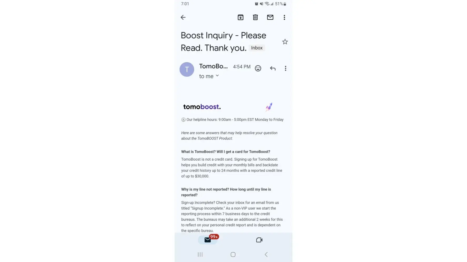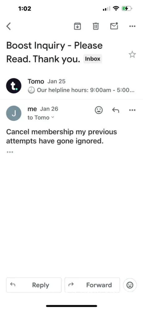 today is February 3 January 3. I sent email to Tomo boost to stop charging me for service. I have canceled by previous email first one January 2 email sent December now it’s February I’ve been charged 999 so 3×9 you get the picture the ripping me off for no service literally I don’t use that app never use the app. I signed up for it but then realized there was no one I could contact no one returns the email no one answers the phone.