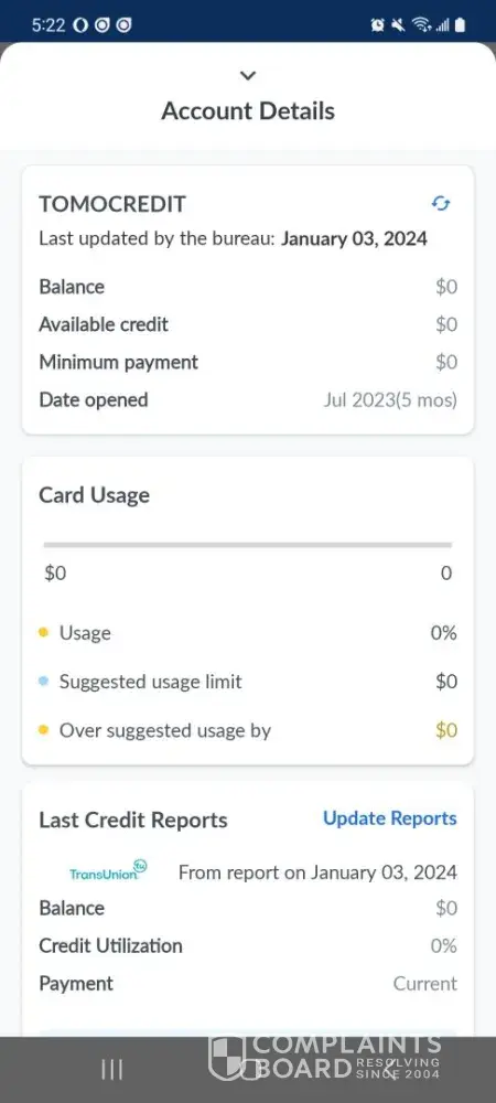 Out of all reported cases, 16 complaints (51%) have been marked as resolved, while 15 complaints (49%) remain unresolved. The most recent resolved complaint, On Tomo's website, it claims that their card reports to all 3 credit bureaus, provides additional insight into how customer issues have been handled.