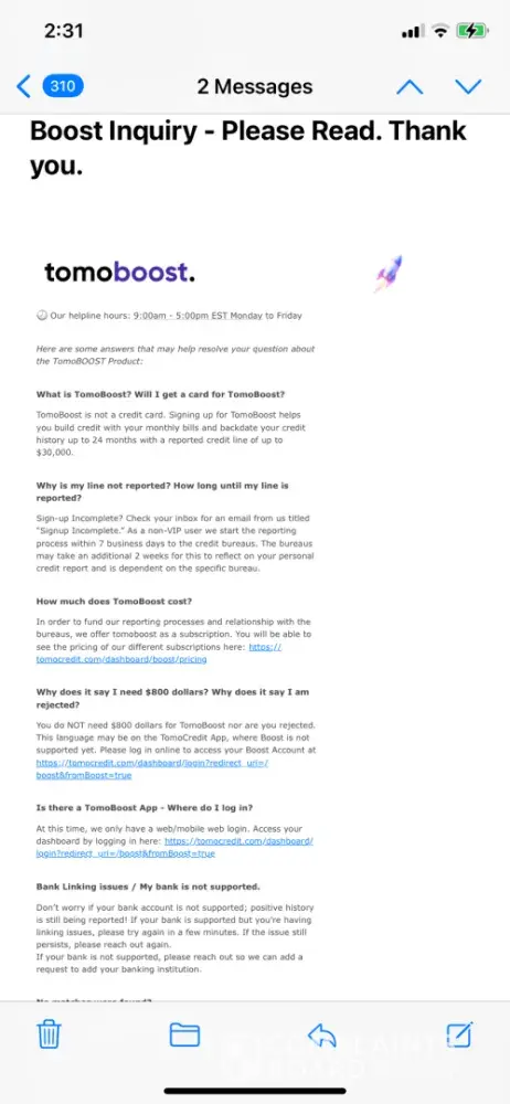 I have contacted this company several times about cancelling this service and every month they claim that they would stop charging my card starting in November 2023. I have multiple email exchanges and attempts begging for them to stop, they never did anything to my credit or improved it in any way. I never received any services or the tomoboost card that they heavily advertise. I originally signed up for a plan that was $8.99, then the following month they charged me $26.99, and then $34.99 for several months with no explanation for the increase - shame on me for not contacting my bank before today. This is a very fraudulent enterprise that needs to be shut down.
