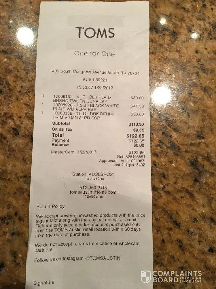 Absolutely horrible customer service. They do not pick up the phone, do not respond to the emails, online chat does not work. They also do not respond to messages on Twitter or Facebook, really TOMS?