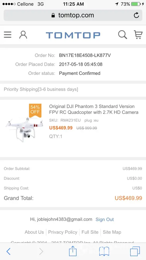 I Bought a DJI phantom 3 standard drone on 18/05/2017 through tomtop.com .