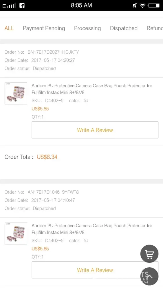 I have attached the screenshot of my product below. I would want to know the delivery of the product as soon as possible. I would want to know the date of it's delivery. It's the Fujifilm Instax 8 sling . Two in number. The order was placed on 17.05.2017.the order status just shows dispatched. It doesn't show on when it will reach me. I want a reply ASAP