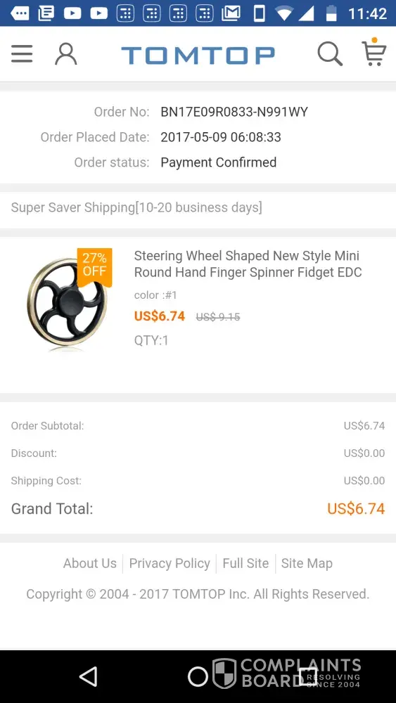 Sir, I ordered finger Spinner on 9/05/2017 and the product order number is BN17E09R0833-N991WY and it is not delivered at my place within time given by tomtop and I have not got any information or details of tracking of product in my registered mobile number..