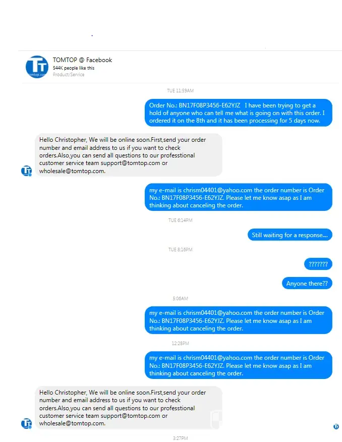 I wanted to get a refund for an item I ordered through TomTop.com. At first I was excited to received my item but the day after I ordered it, I was asked to send a picture of my credit card(both sides) showing the first four and last 4 numbers of my card. I found this suspicious and emailed them to cancel my order instead and get a refund. It's been more than 48 hours and I have not yet received any reply. I'd hate to file a chargeback with my bank since it's such a long process in my end.