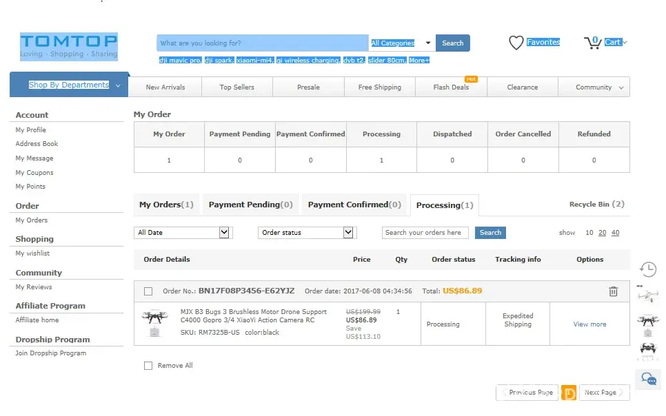I have purchased a Skytech TK110HW Wifi FPV Foldable Quadcopter-RTF + Spare battery + Spare guard / landing gear / propeller combo set, Order No. BN17F09G5916-9E0DSZ on 2017-06-09, but until now your website shows the order is still under process.