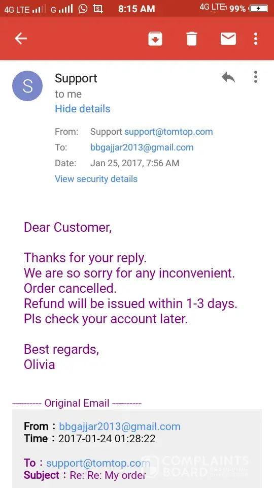The following email that I sent TomTop after receiving my order just within time limit, , . Now for the Bad news !