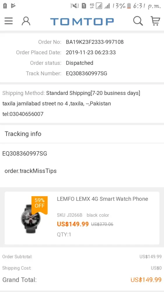 This is my order & track no. i order my thinks on oct-2016, still i did not get my order thinks. so many times i chat with customer service but i did not get any proper answer from them. since 4 months no any update about it .