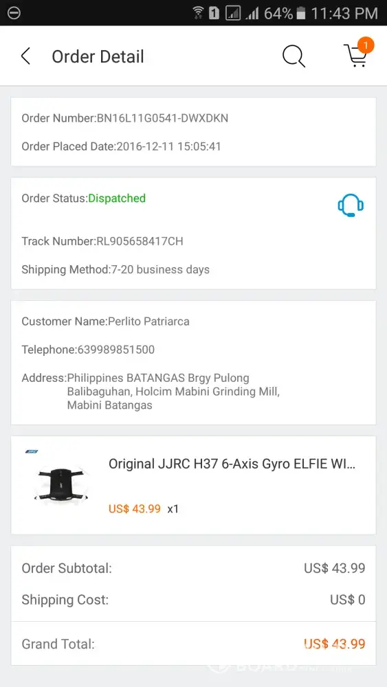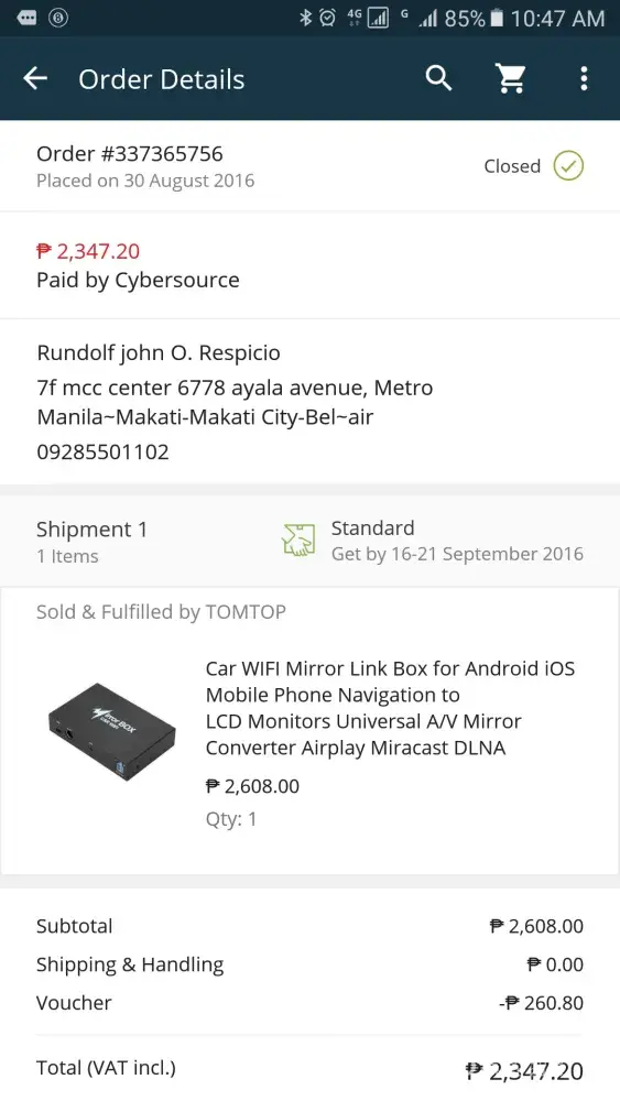 Im one of your customer who was order in your shop which is TomTop, im just asking for the followup regarding the ordered item on see attached pictures/files since it was already paid and dispatched.