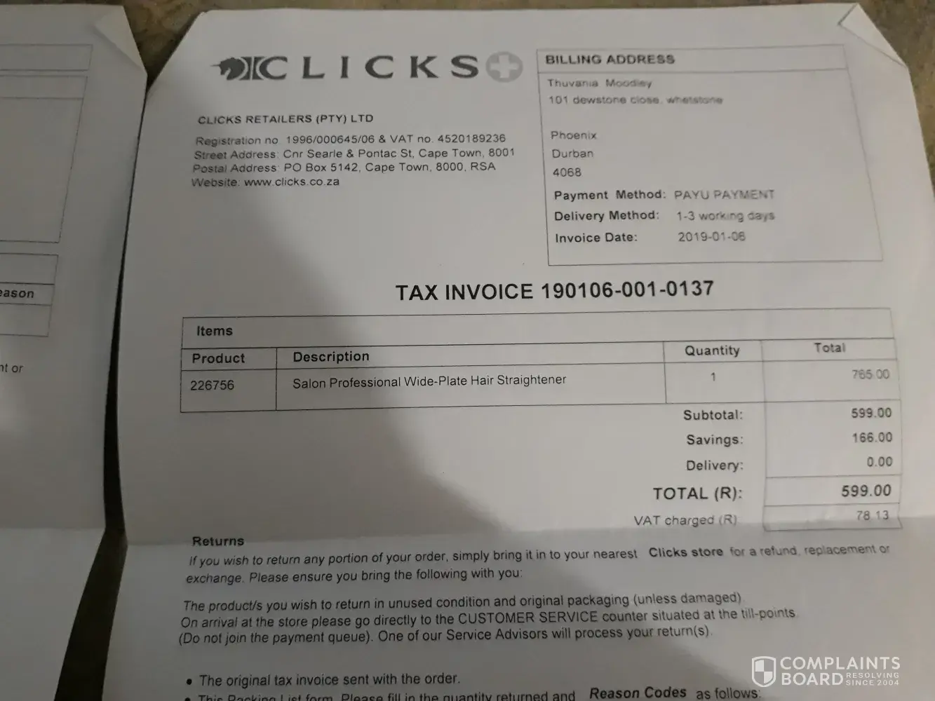 I hope to hear from you soon with a solution to this matter, I also do not have the slips for any of this I purchased my iron at Clicks in Canal Walk if I remember correctly.