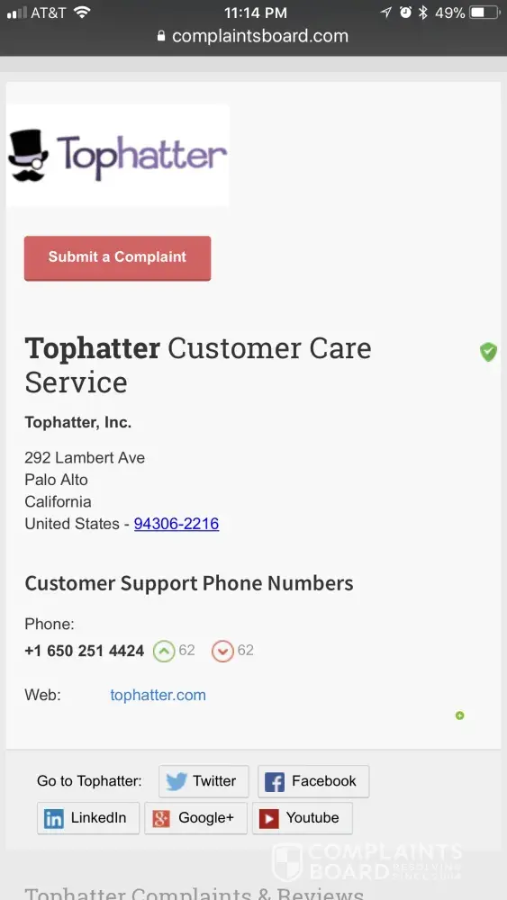Your Customer Service option is hard to find and worthless. If you really want to provide quality customer support then why is not available on the TopHatter Web site? I found this site by typing in complaints about your company.