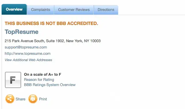 TopResume is rated "F" by the BBB. You can see their profile here: http://www.bbb.org/new-york-city/business-reviews/resume-service/topresume-in-new-york-ny-151339