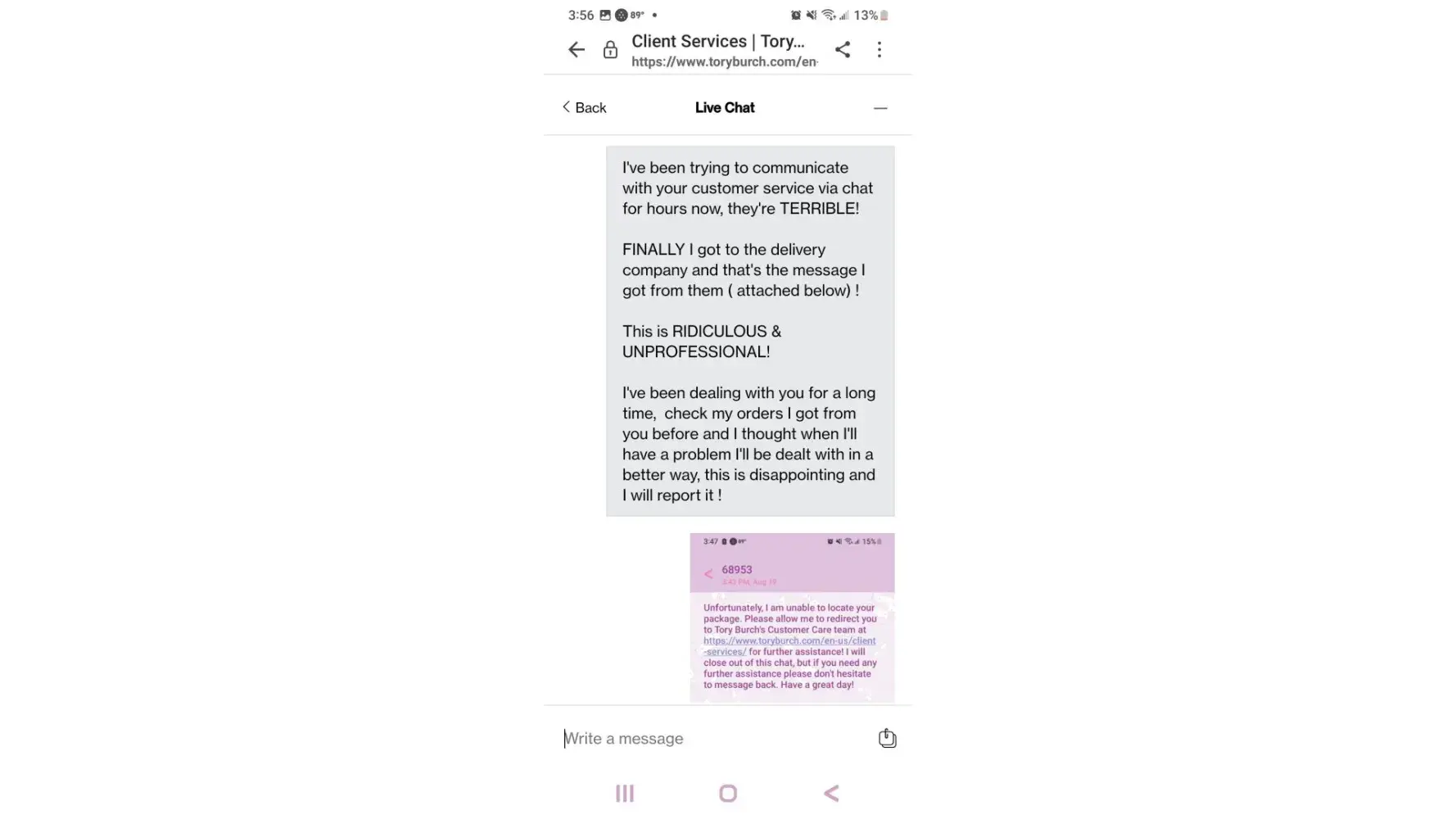 I emailed their customer service and chatted with couple of them online they kept tossing me back and forth to contact the shipping company,I did as you can see attached& the shipping company mentioned they have no information regarding my order & tossed me back to Tony Burch customer service AGAIN, as seen attached.