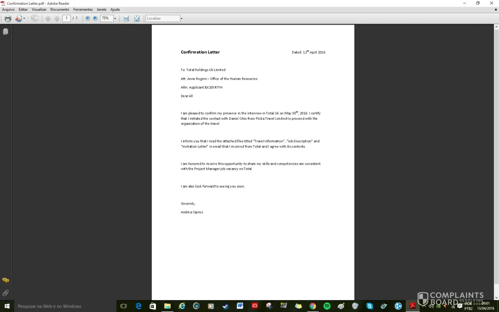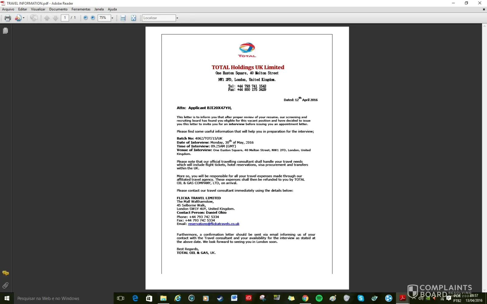 I sent my resume through Linkedin for this role on the 25th of August. LinkedIn Se ha recibido tu solicitud. ¡Buena suerte! Hola, Michelle: Hemos recibido tu solicitud para: Administration Manager TOTAL Argentina Yesterday I received this email with some attachments, with the Logo of Total with some instructions to follow to have a face to face interview. Attn: Michelle Couso, Thanks for your interest in the Total UK Family, please note that your resume submitted via LinkedIn has been evaluated and you have been short listed for Job interview. Please go through the attachments for important details of the invitation. We look forward to seeing you soon. Regards, Engr. Daniel McBrynt (Human Resource Relation Officer) TOTAL UK I wrote to the travel agency and they sent me this email today with 3 attachments, one for the Uk Visa, one asking me for £ 1.199.87 for travel arrangements. Batch No: 1093/TOT/13/UK Dated: 09/10/2015 Attn: Michelle Couso, Welcome to Crystal Travels Consultancy and Tours, United Kingdom. We confirm the receipt of your mail and the content has been noted. Please note that we have also received a confirmation email from Total as regarding your appointment with them and have been given the go ahead to proceed with your travel arrangement. We advise that you strictly work in line with our arrangement to enable us render quality service to you. We shall be handling Your flight, hotel booking and visa application (Should you be requiring a UK visa). Also, arrangement for your pick-up from Heathrow airport to your Hotel and vice versa, and from your hotel to interview venue and vice versa, will be handled by us. We also understand that visa processing might be stressful and time consuming when applying in your country, but with our help and services, your visa will be issued within a short space of time despite the limited time. We advise that you follow all our instruction and proceedings in order to get your visa in a very short possible time. Download the attached documents, fill the applicable, scan and send back to me as soon as possible to enable us proceed with your travel arrangement. NOTE: If you don't need a UK visa, I advise that you ignore the visa application form and passport photo size section and send every other document. And also note that all travel expenses will be refunded to you on arrival to London by the HR and account department of TOTAL Holdings UK Limited. Please confirm from your end that you have received this email. We hope to hear from you soon. Regards Mr. Christopher Fraser, (Visa Processing, Immigration and Booking Department) Crystal Travels Consultancy and Tours Colliers Green, Cranbrook Kent, TN17 2LS, United Kingdom Tel: +[protected] Tel: +[protected] Fax: +[protected] Email: crystal.[protected]@outlook.com [protected]@crystaltravelandtours.com I will try to contact Total Oil & Gas to inform of this situation because is a very sensitive issue.