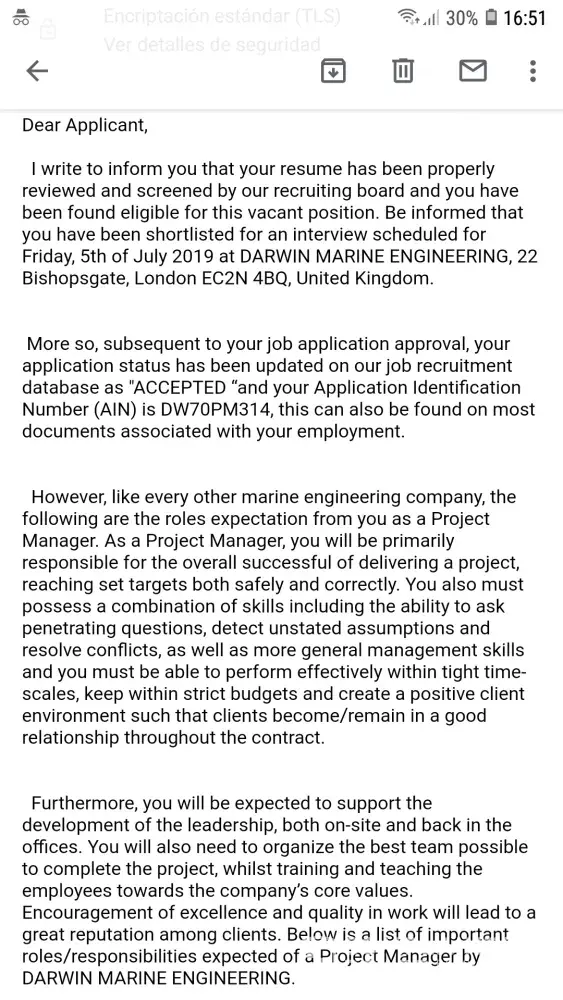 Below the first email received at 3rd May by [protected]@recruitment-depart.com for a position of Project Manager.