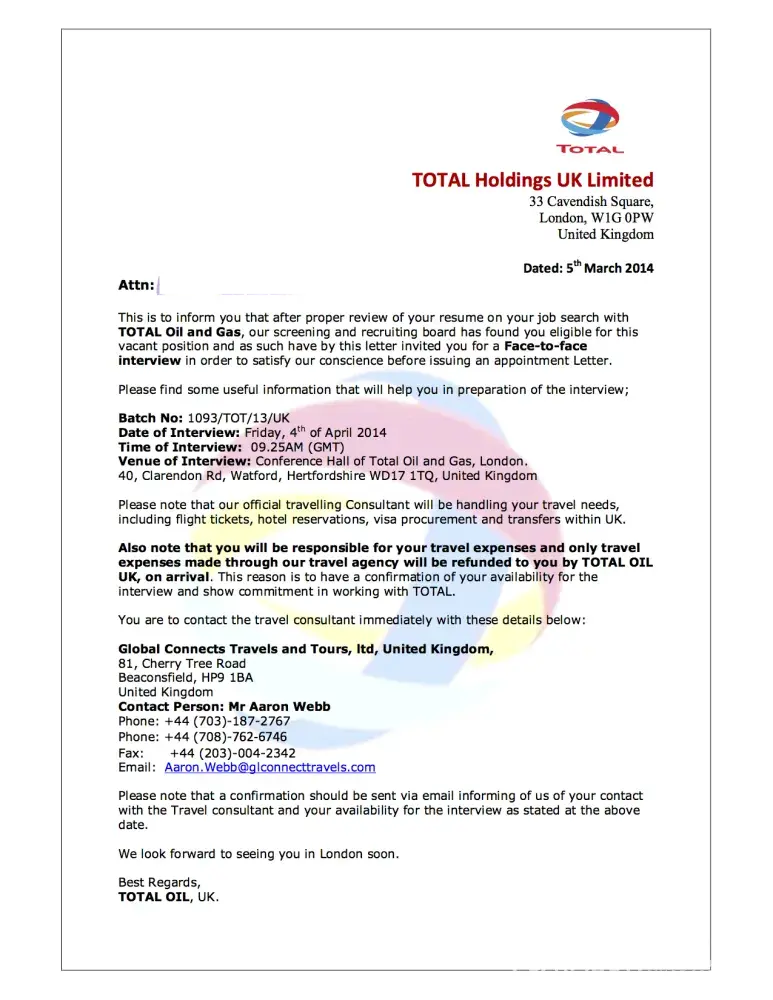 I've come across other similar scams, all of them using TOTAL Oil and Gas name, but with different variations and travel agencies: