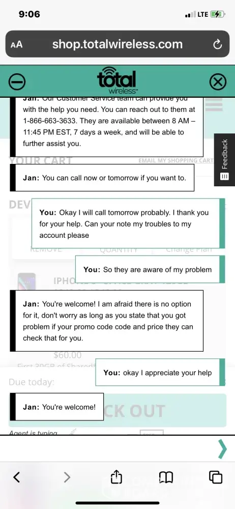 Desired outcome: Very disappointed on the service and the communication from total wireless