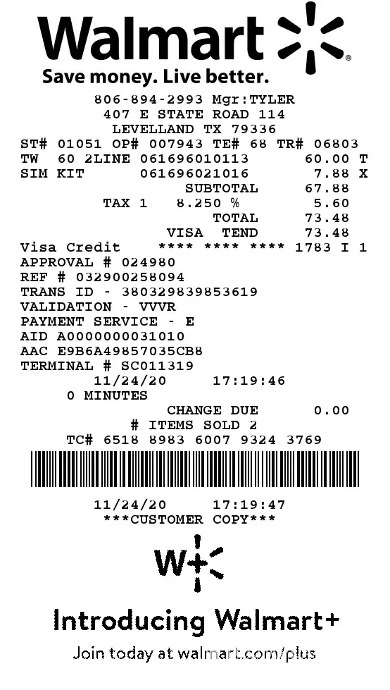 I purchased the $60 Service Plan for 30GB of data for 2 phones on 11/24/2020. I had my AT&T Samsung S9 phones unlocked and activated them on 11/27/2020 with Total Wireless. Within the first day, I was having trouble sending and receiving MMS texts. I called and talked to customer service and looked online to get this resolved. It was good for a few days. Then we stopped receiving those messages correctly. Gifs would be still and pictures would be fuzzy. After probably 20 hours back and forth with customer support, and going through every step they had all the way down to factory reset my phone and it still not working, they said they could not help me. I gave up on that, but then we started not receiving calls and SMS texts. I called to get a refund for our services and I was told that if they did that then we would end our service right then. In order that I had continuing service, I asked if I could get another service set up and then call back to get a refund. I was told yes that would be fine. That was on a Friday and they were supposed to call me back on Monday. I never received a call to close the account and get a refund. I got my other cards in on Tuesday 12/15/2020 for my new service and ported the numbers over. I called Total Wireless later to get my refund and they are now saying that since the numbers have been ported out then they can't see any of the past correspondence and can't give me a refund for the intermittent service that I received. I would like to have a refund for the full amount I spent on the plan and the 2 sim cards. The total is $82.01. The receipt I provided shows the plan and 1 sim card. The other $8.53 is for the other sim card I purchased at another store because they only had one at that store.