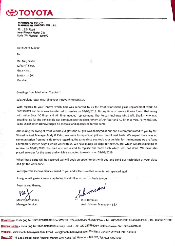 * Madhuban Toyota has put the A/C grill of some old accident car. Can a authorised service center do such things ?