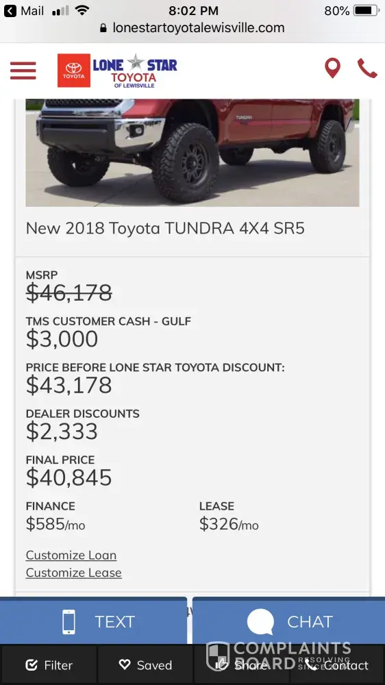 I requested a quote for a new 2018 Tundra SR5 4x4 that had the option I wanted and Lone Star Toyota would not honor what they had quoted. The manager called and said they would honor it but would have to pay for items that were listed on their site under that vehicle description of a cost of $1800. Those items are listed under that vehicle and quote that was sent. I will not buy a vehicle from that dealership. I'm curious as to how many other people have been ripped off. They said that the wheels, tires and leveling kit wasn't put on the site but they advertised this vehicle. Bad business
