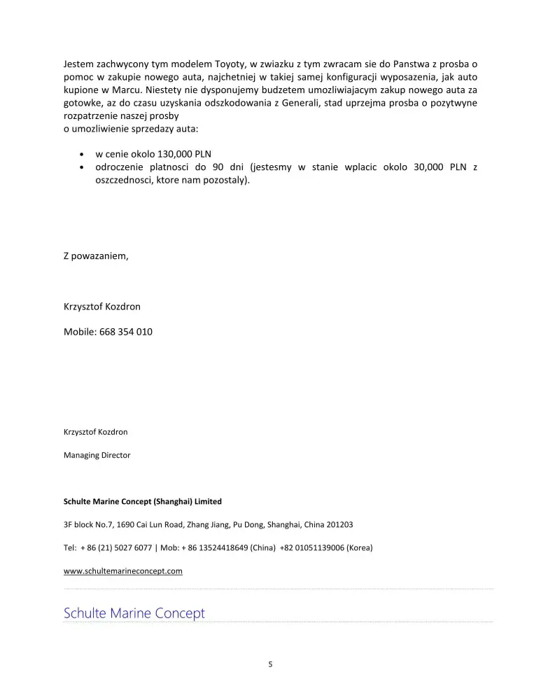 Two days latter, 24th May, have sent to Toyota Motor Poland both car specification and cost calculation prepared by Toyota Carter Gdansk, Poland.