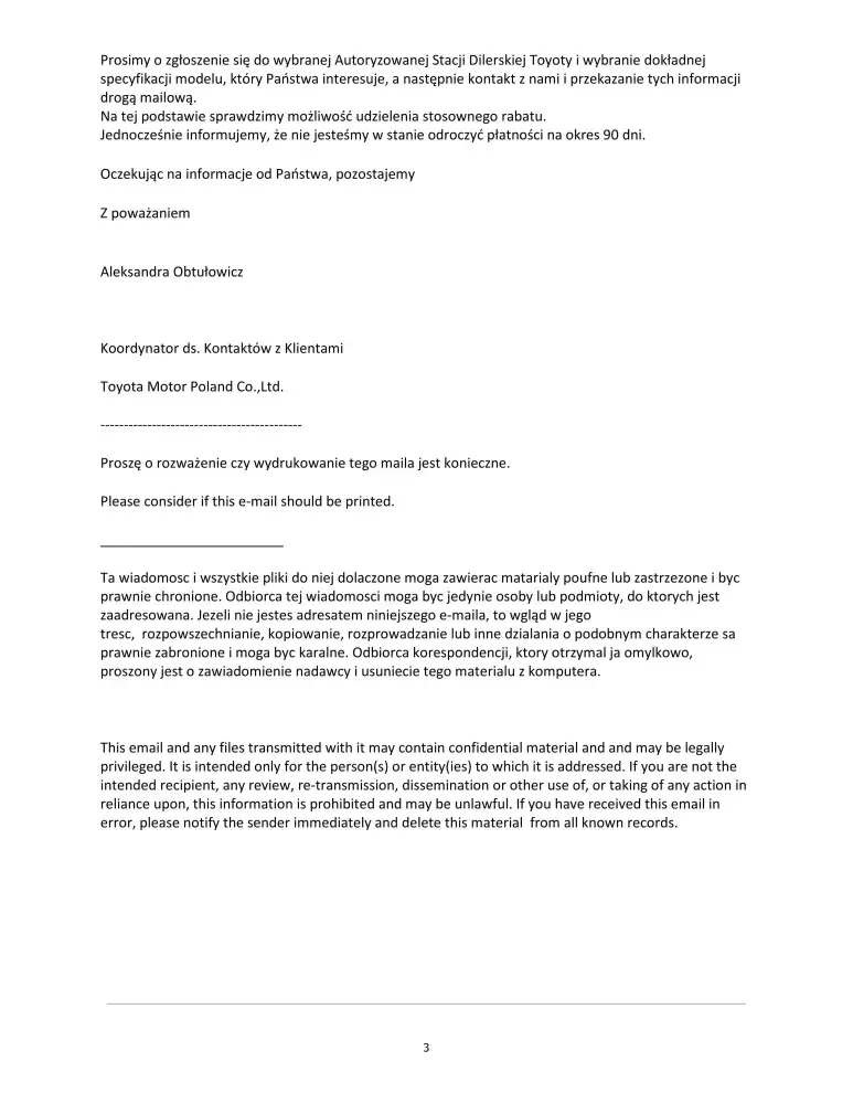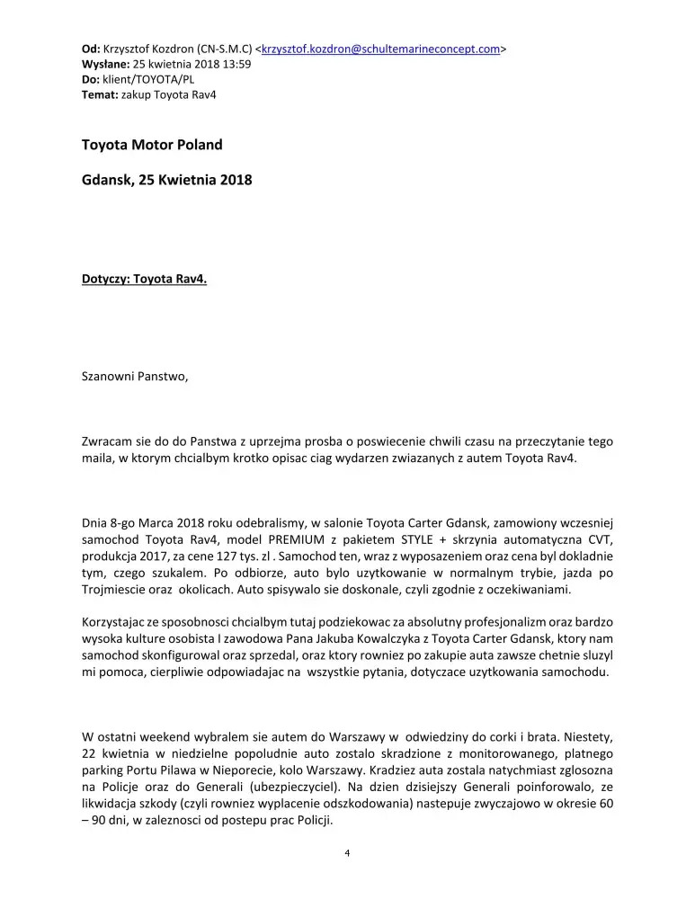 On 25th April 2018 have sent humble e-mail to Toyota Motor Poland asking politely for help with the purchase of the same model, same price, thought with deferred payment (due to a/m min.90 days insurance/Police processing period). Have politely asked for 90 days deferred payment, and declared initial payment of 30, 000 PLN from rest of the family savings (total cost of the car was about 130, 000 PLN).