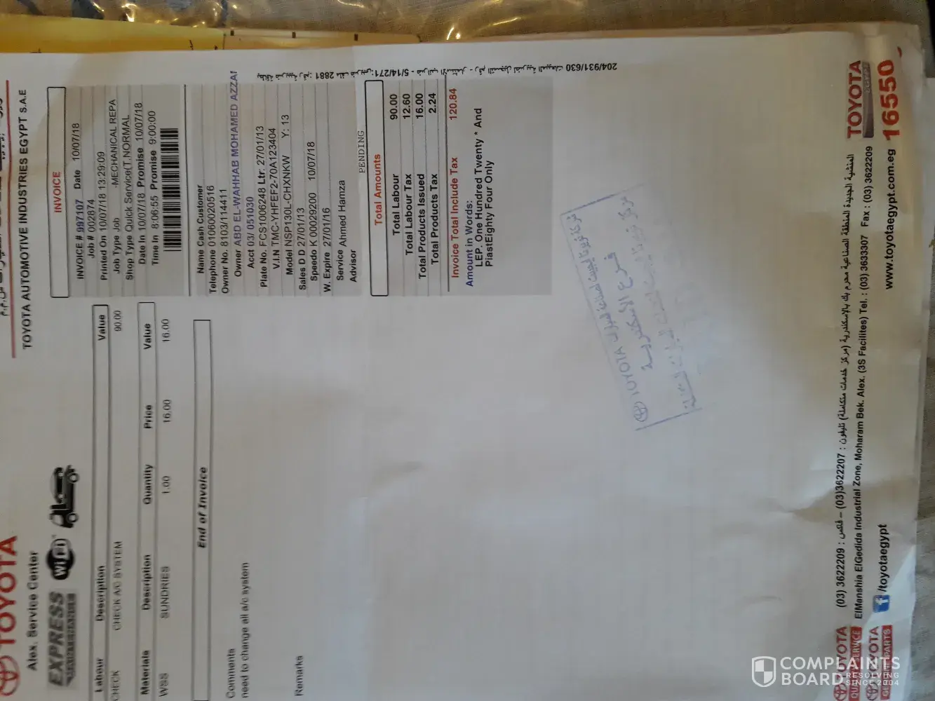 It is not fair to pay total of approximately 46000 EGP (40000 EGP spare parts + 6000 EGP labour) in spite of adherence strictly to Authorized Toyota service center programs